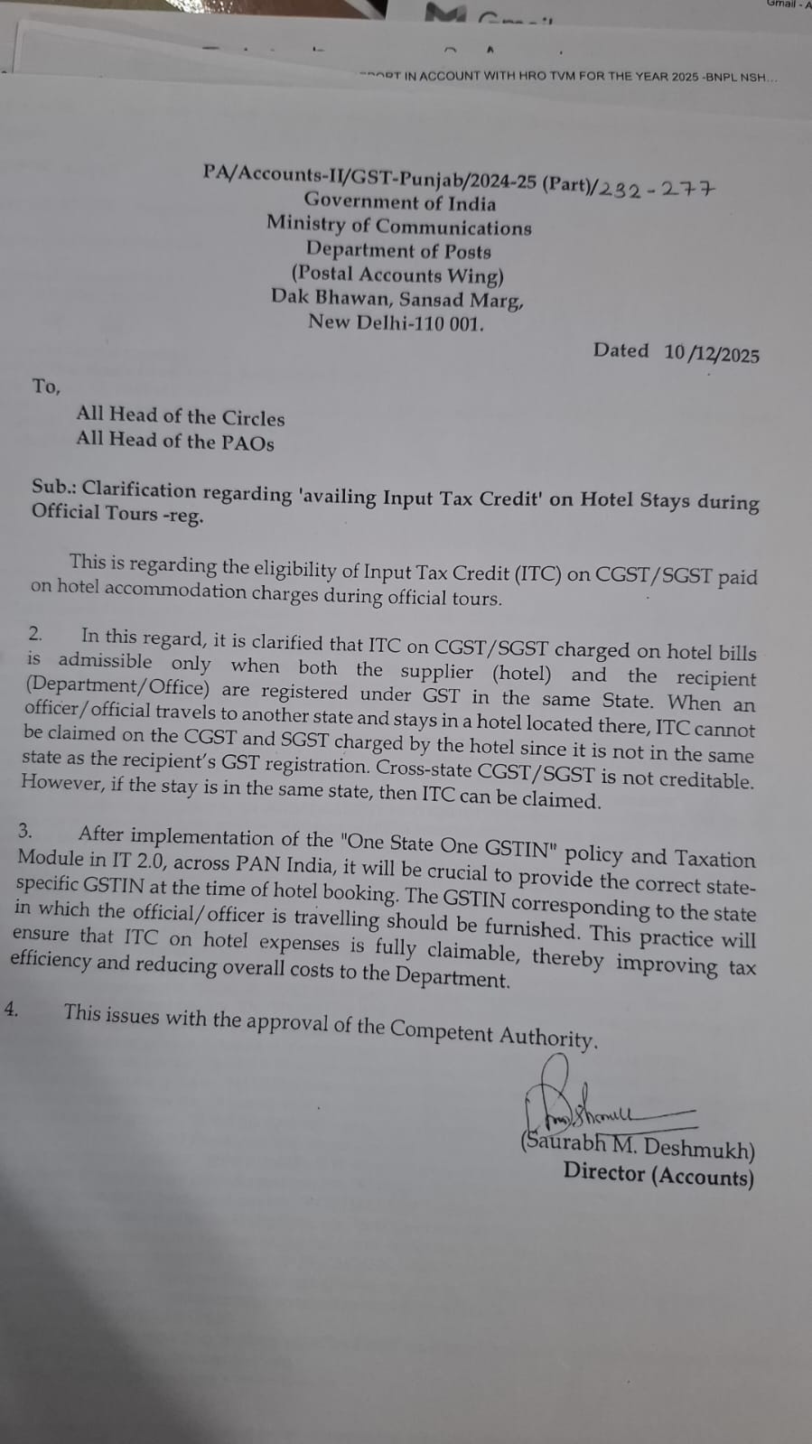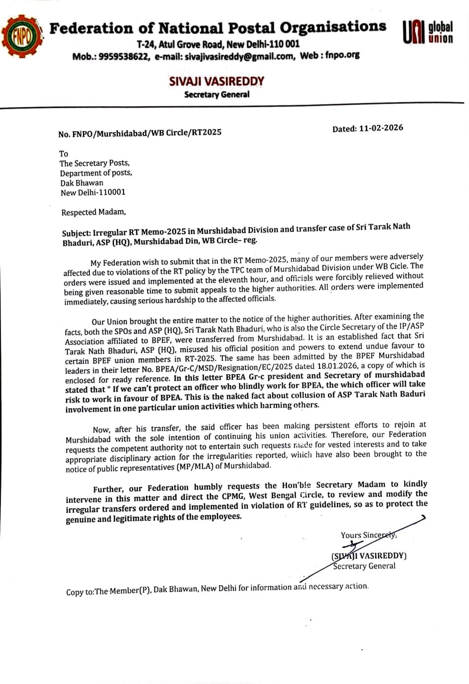 SG FNPO letter to Secretary Posts demanding Revision of TRCA who joined after 1.7.2018 and effect date should be 1.12.2025 atleast for getting 8th CPC benefit.