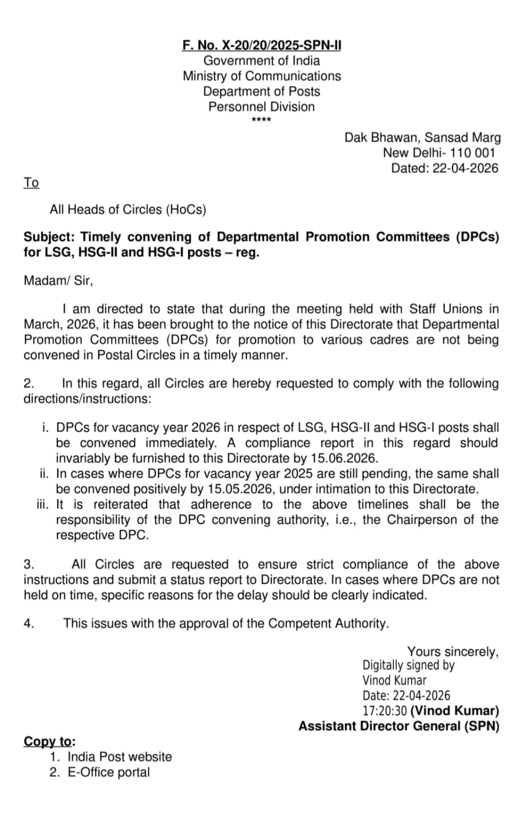 The Federation of National Postal Organisations (FNPO) has actively urged the Secretary (Posts) to ensure the timely convening of Departmental Promotion Committees (DPCs) for Lower Selection Grade (LSG), Higher Selection Grade-II (HSG-II), and Higher Selection Grade-I (HSG-I) posts to address severe promotional stagnation. 28/04/2026