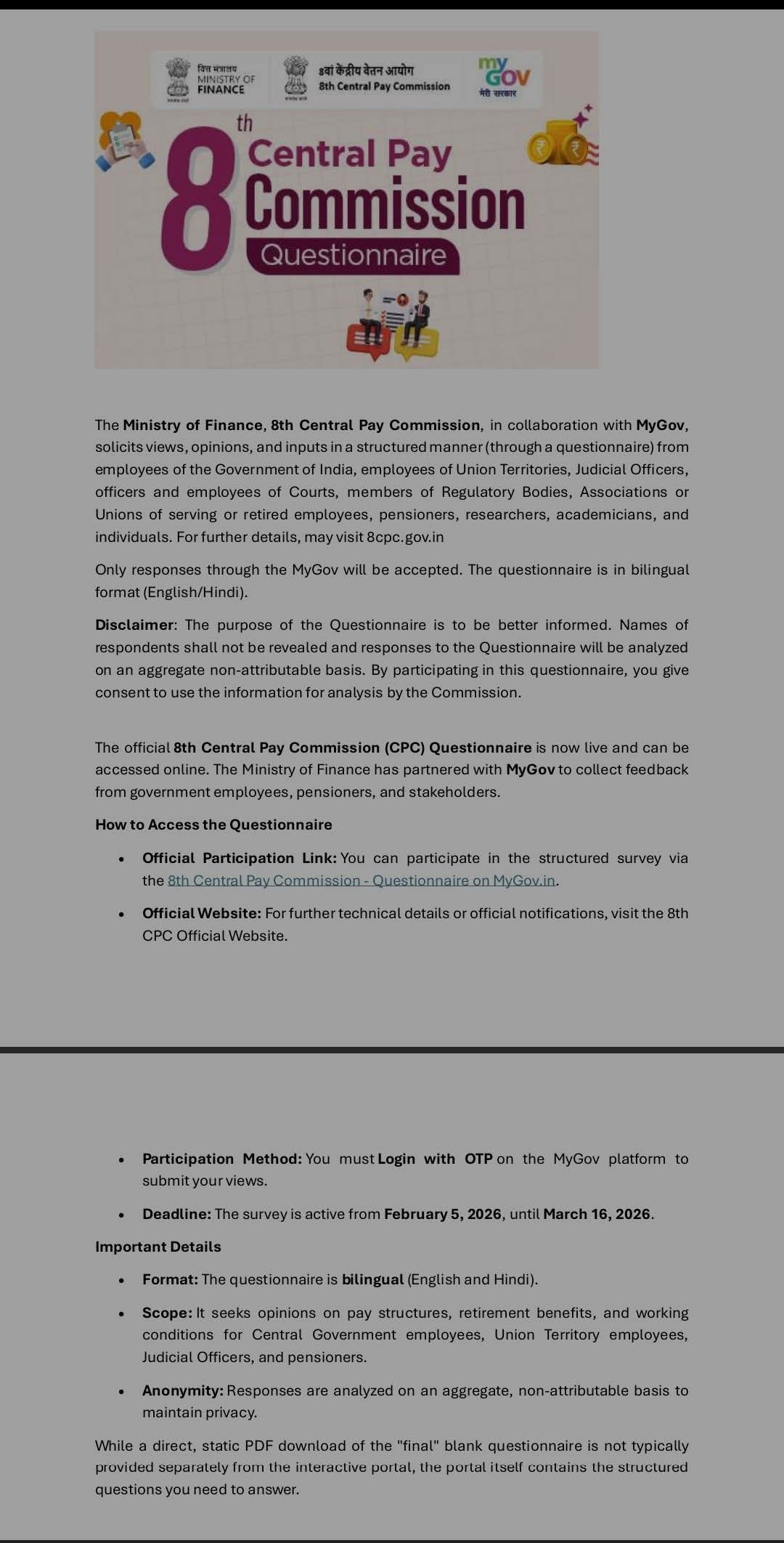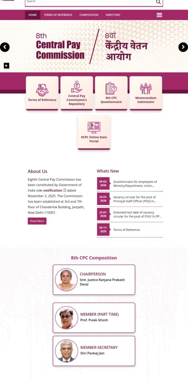 8th CPC started website and requested replies for qutionier from Unions, Individuals and Pensioners of Central Government.