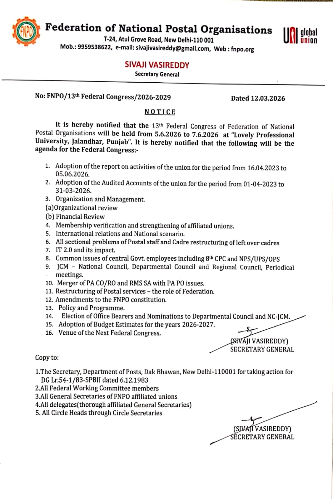 Notice for FNPO 13th Federal Congress at Lovely Professional University, Jalandhar on 6, 7 June 2026